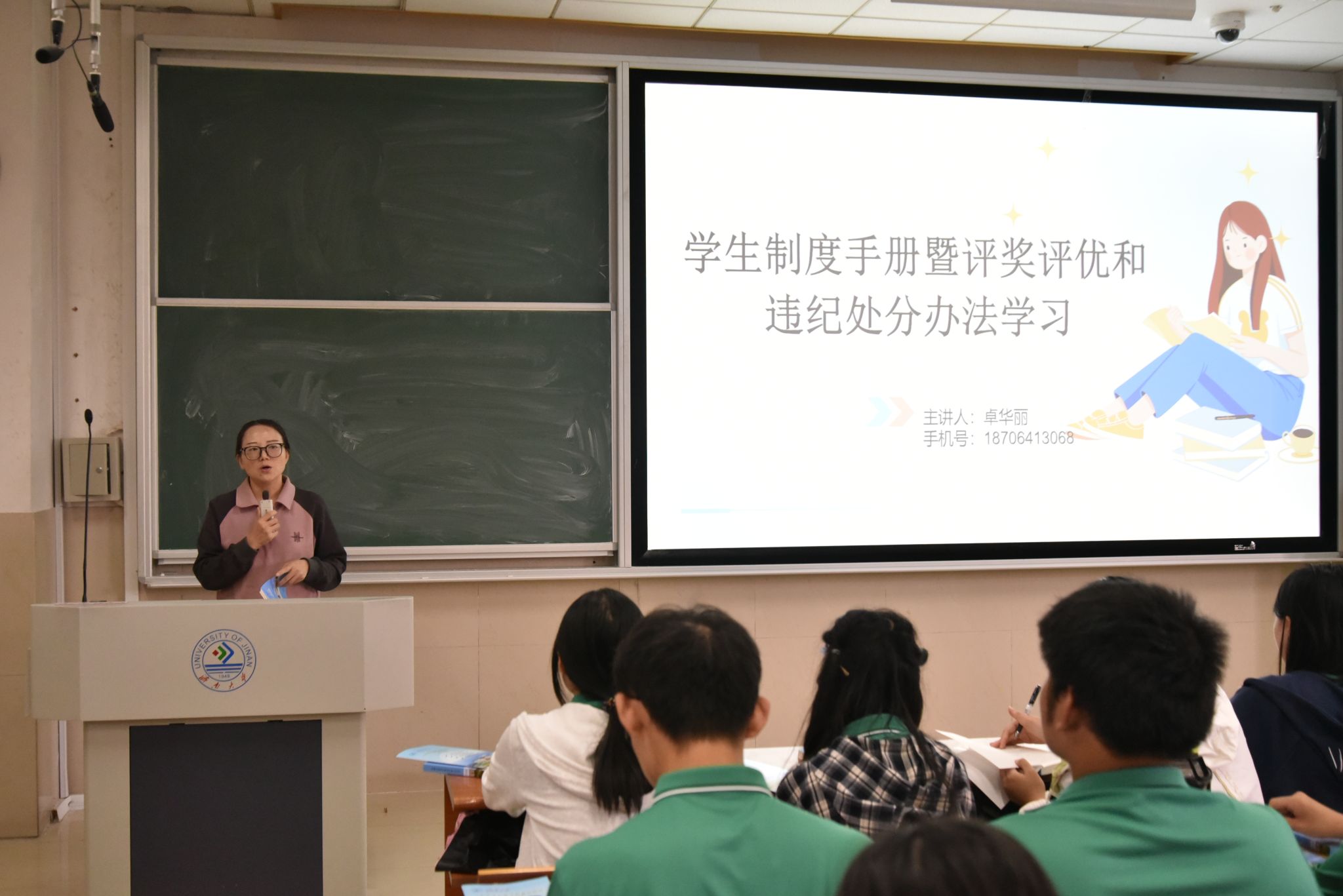 卓华丽老师系统讲解学生制度手册,重点解读评奖评优细则与违纪处分办法,引导新生树立规则意识。