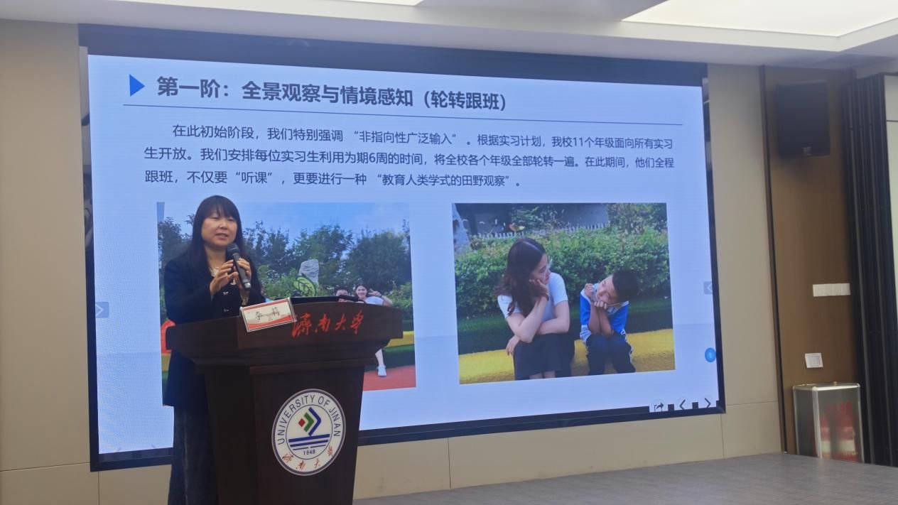 院长赵斌教授指出,融合教育、科技赋能与个性化支持是当代特教发展的核心方向,未来特教教师需具备跨专业协作、数据化评估与差异化教学等关键能力,实现从“知识传授者”到“成长支持者”的角色转变。博山区特殊教育中心学校校长李莉基于校地共建实习基地的实践,分享了“六阶递进”特教师范生实践能力培养模式,诠释了“以生为本、实践为要、协同为翼”的育人理念,呈现了从机制搭建到实践落地的完整闭环。