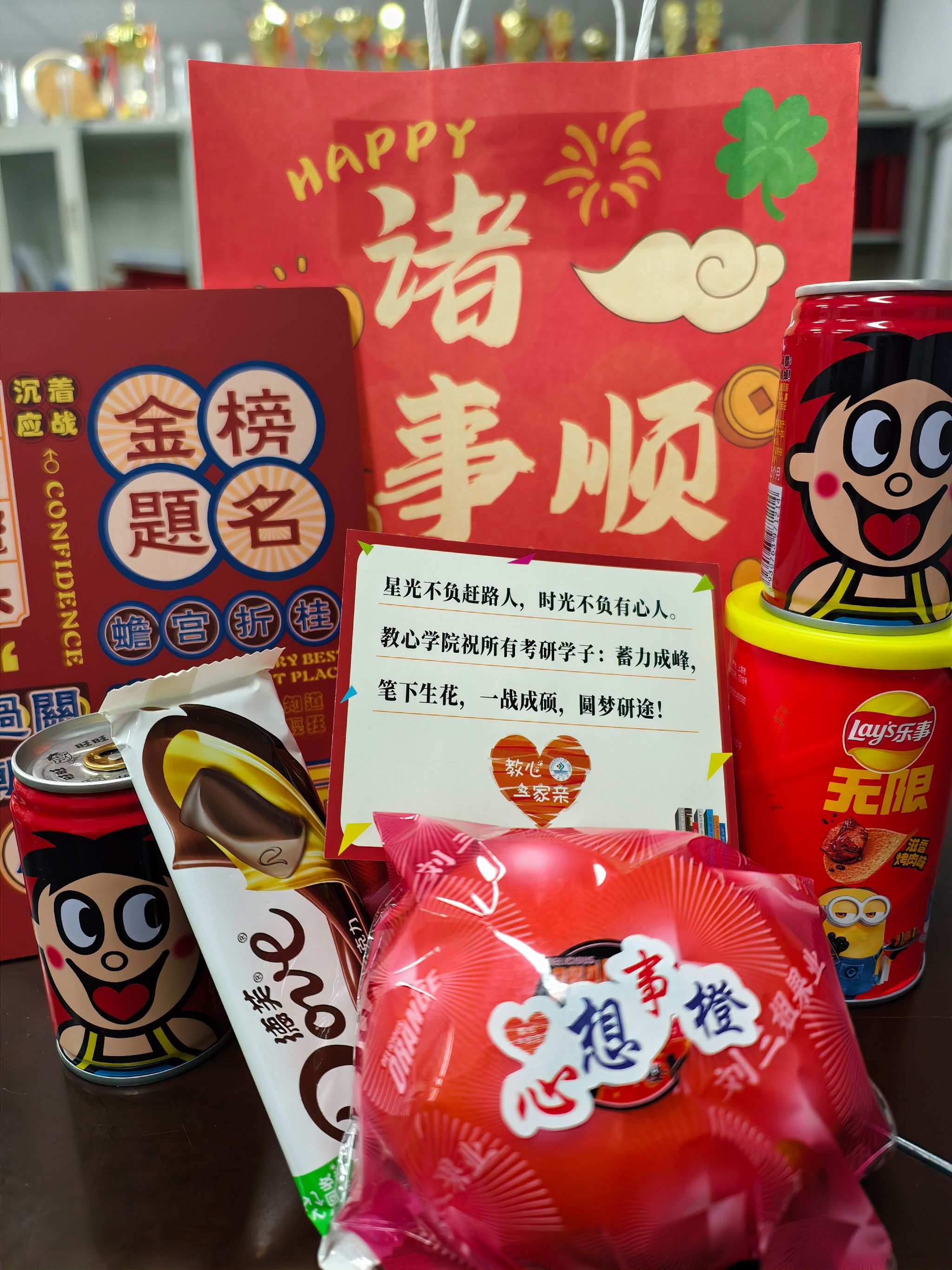 为每一位2026届考研学子精心准备了“考研加油礼包”。礼包内含寓意美好的各式礼品:印有“一战成硕”的祝福卡片、象征“心想事‘橙’”的橙子、寓意“旺气加持”的旺仔牛奶、代表“巧克难题”的德芙巧克力以及期盼“乐事将至”的乐事薯片。这份充满心意与巧思的礼包,让紧张备考的学子们深切感受到了太陽城app