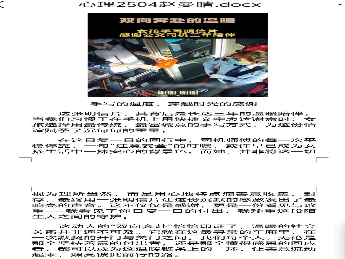 活动中,同学们搜集并截图保存触动心灵的新闻瞬间,再以真挚文字撰写个人感悟。征集期间,大量饱含温度的作品涌来:从路人自发帮忙捡拾洒落的玉米,到社区为外卖员特设暖心厨房;从街头陌生人的举手相助,到基层工作者的默默坚守,同学们发掘的故事覆盖社会生活方方面面,每一张截图都是人性光辉的生动定格,每一段感悟都是青年视角的深刻共鸣。“寒风再烈,也抵不过人心的滚烫”“秋冬的寒凉或许无法避免,但人与人之间的善意与关怀,总能汇聚成驱散寒意的暖流”——这些直白又真挚的话语,是同学们对社会温情的细腻解读。