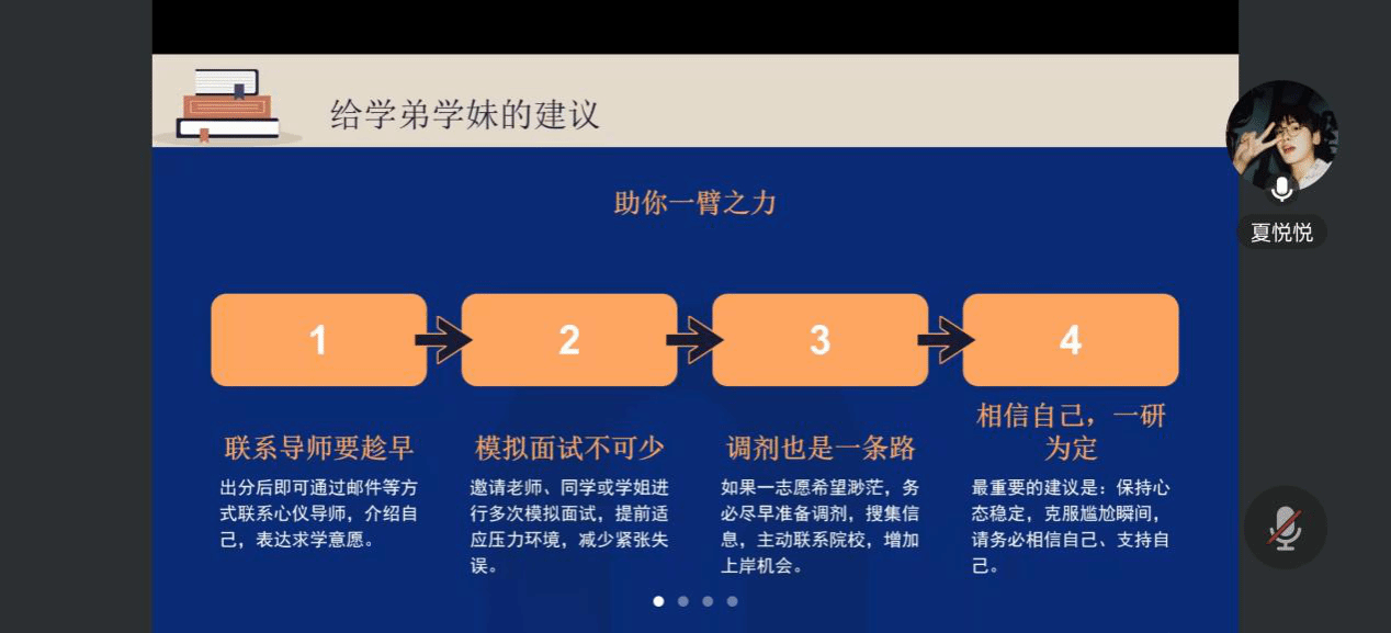 夏悦悦(成功考取青岛大学研究生)强调“信息优先、内外兼修、热点结合、模拟为要”的备考策略。她提出需在出分后立即启动“分阶段计划”,专业课回归教材构建知识体系,并紧密结合前沿热点拓展思维。面试准备个性化自我介绍,并提前梳理科研经历。她强调模拟面试是查漏补缺、缓解紧张的关键,而提前联系导师与积极准备调剂信息,则是增加上岸机会的重要保障。